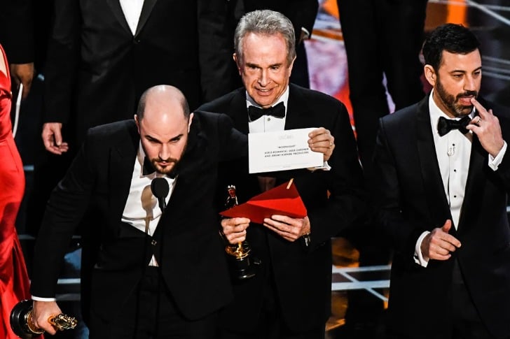 2017 年奧斯卡頒獎典禮上,華倫·比提 (Warren Beatty) 和費·唐娜薇 (Faye Dunaway) 宣布最佳影片得主時,發生了奧斯卡史上最混亂的時刻之一。比提打開信封後顯得一臉困惑,隨後將信封遞給唐娜薇,她興奮地宣布「《樂來越愛你》」獲獎。《樂來越愛你》的製作人上台開始發表得獎感言,在眾人的歡呼聲中慶祝他們以為的勝利。
