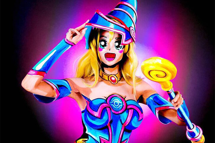 Diese Darstellung der Dark Magician Girl stammt von Kay Pike. Die Figur aus dem Anime “Yu-Gi-Oh!” verfügt über Zauberkünste und kommuniziert telepathisch. Pike vereint in ihrer Inszenierung die charakteristischen Elemente der Figur: schwarze Roben, glitzernde Details und ein Magierschwert.