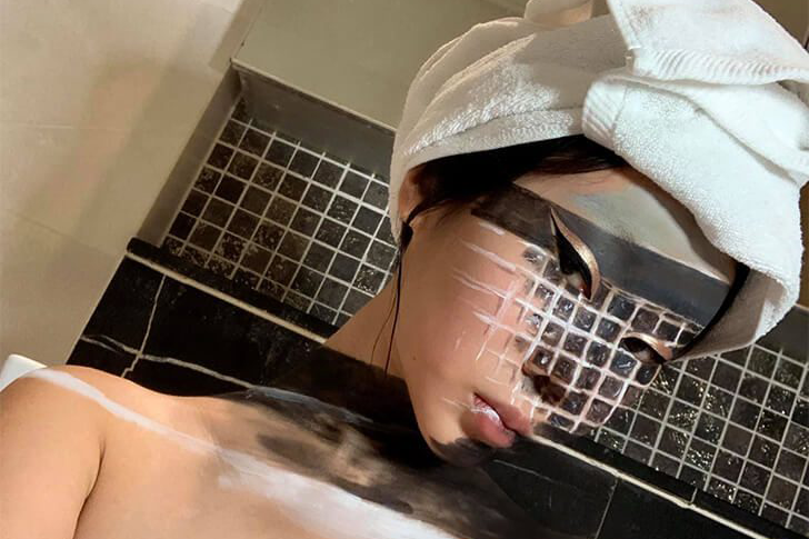Um den Effekt zu verstärken, hat sie einen weißen Handtuch um den Kopf gewickelt, der an eine Art “Lückenfüller” erinnert, der die Transition zwischen Körper und Wand glättet. Nach der Fotosession wird sie vermutlich lange im Badezimmer zugebracht haben – der Preis für diese künstlerische Transformation: Stundenlanges Abreiben von Körperfarbe.