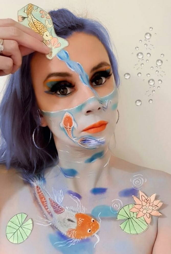 Die Zucht von Koi-Karpfen (Cyprinus rubrofuscus) ist in Japan eine Kunstform: Ihre orange-scharlachfarbenen Fische werden nicht nur für ihre Schönheit gepflegt, sondern auch für ihre symbolischen Bedeutungen. Ein guter Teich bedarf eines sorgfältigen Filtersystems, um Wasserqualität und Lebensraum optimal zu halten – genauso wie diese Bodypainting-Künstlerin ihre Techniken perfektioniert, um Körper und Symbolik nahtlos zu verbinden. Ein werk, das friedvoll die Schönheit von Stillstand und Bewegung vereint.