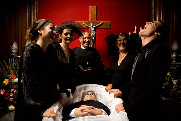 A woman laughs at a funeral, then collapses in terror. What happened?