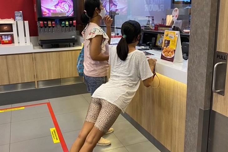 In what appears to be a simple fast food order, one girl has managed to turn a routine task into a full-body stretch. While most people would stand upright at the counter, she has chosen to lean at an angle so dramatic it looks like she’s defying gravity. With her arms propped casually on the counter and her legs straight out behind her, she resembles someone mid-yoga pose rather than mid-order.