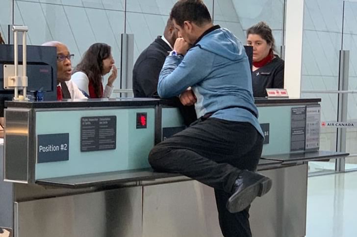 At first glance, it seems like a typical moment at an airport check-in counter—passengers waiting, staff assisting—but one man manages to completely redefine how people lean while asking for information. With one foot firmly planted and the other leg awkwardly hoisted onto the counter, he strikes a pose that looks like a modern-day version of Rodin’s “The Thinker,” if that sculpture had lost its chair. The way his body twists into the conversation adds an extra layer of drama, as if leaning in literally gives him the upper hand.
