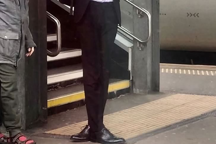 At first glance, you might do a double take when looking at this photo. The man in a business suit seems unusually tall, almost comically so—until you realize what’s really going on. A perfectly timed alignment with the person behind him creates the illusion that he’s got incredibly short legs wearing sandals. It’s the kind of blink-and-you’ll-miss-it moment that transforms a normal train platform into a stage for visual comedy.