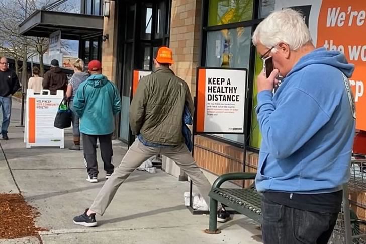 This photo captures a man taking the concept of “keeping a healthy distance” to the next level—literally. With his legs stretched impossibly far apart, he manages to stand in line while maintaining more than just the recommended six feet. It’s a pose that blends creativity with a touch of yoga, all while adhering to public health guidelines in the most unconventional way imaginable.