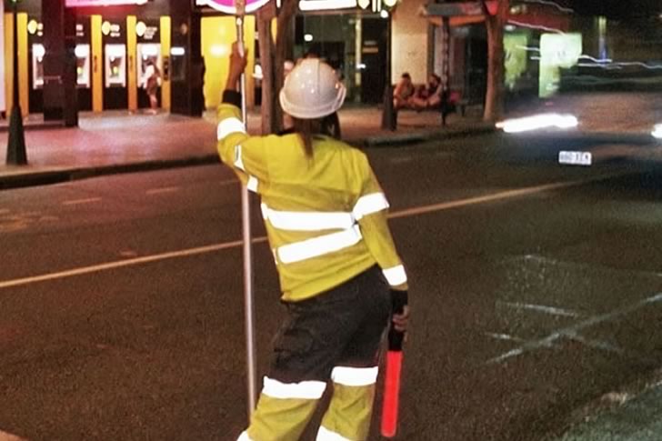 Sometimes, even a construction worker directing traffic needs to add a little flair to the job. This confident stance, complete with one hand casually resting on the stop sign and one leg bent like they’re about to start a dance routine, brings unexpected drama to an otherwise routine task. With the reflective uniform glowing under the city lights, the whole scene feels like a freeze-frame from a stylish urban performance.