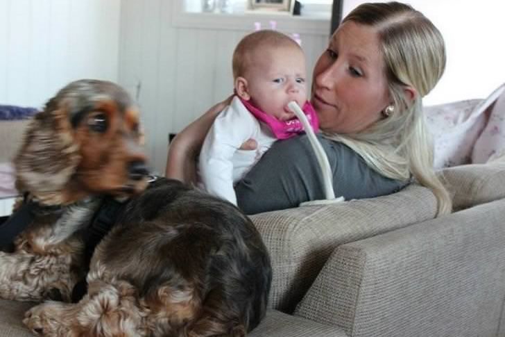 What elevates this from routine parenting mishap to photographic gold is the look on everyone’s face. The mom’s expression is one of stunned realization, the baby looks oddly satisfied, and even the dog seems caught mid-turn, as if trying to escape the splash zone. It’s a split-second spectacle of bodily betrayal and comic timing, proving that sometimes the most memorable moments are the messiest.