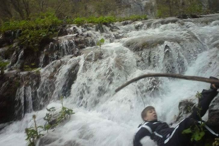 Nature walks are meant to be serene, peaceful escapes from the chaos of everyday life—but no one told this guy that gravity had other plans. In this perfectly timed photo, we catch the exact moment a hiker loses his battle against a slick waterfall, captured mid-slide with a look of dazed surrender. One hand still clutches a stick in a last-ditch effort to regain balance, while his body is halfway committed to a watery downfall.