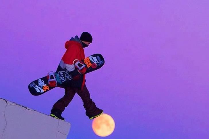 Though the snowboarder is clearly grounded on a ledge, the photo gives him a surreal power—to stroll across space as easily as across snow. It’s the kind of accidental masterpiece that turns a mundane moment into something that feels mythic. For a split second, we’re invited to believe in the impossible, where boarders step on moons and the sky bends to our imagination.