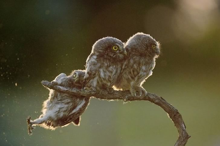 What begins as a peaceful perch for three baby owls quickly turns into a moment of unexpected comedy. While two of the owlets remain perfectly balanced and focused, their third companion finds itself mid-slip, caught in the split-second between standing tall and tumbling off the branch. The timing of the photo couldn’t be more flawless—the little owl’s body is already in free fall, one leg stretched out as if it’s doing an accidental dance move, eyes wide in a mix of surprise and regret.