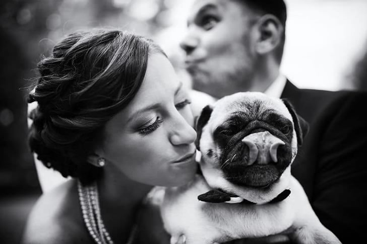 The bride is beaming with excitement, the groom looks casually distracted, and their little dog? Completely uninterested. As the camera clicks, the pup glances away, unimpressed by all the fuss and clearly not feeling camera-ready.