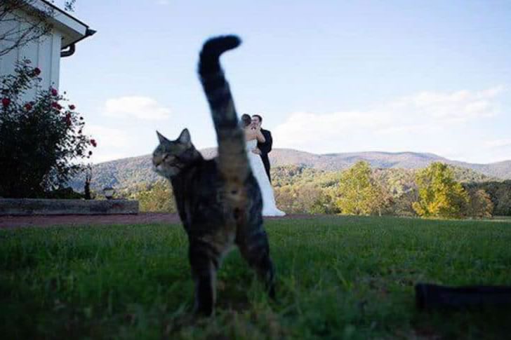 Cats are usually known for their quiet elegance and charm, but this one had other plans. As the couple prepares for a loving photo, their feline friend turns around and proudly presents its backside to the camera.