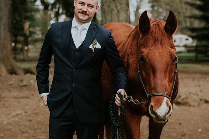 This noble horse adds a touch of grandeur, reflecting the groom’s connection to nature. Its inclusion turns the photo into a striking portrait, blending strength and celebration. The groom’s pride shines through, complemented by the horse’s impressive presence.
