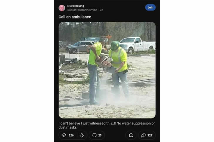 Breaking News: Local bricklayers discover the ancient art of ‘Dry Cutting’ – a ritual passed down through generations where lungs are considered optional equipment. Witness the hair-raising, lung-clogging, dust cloud extravaganza!