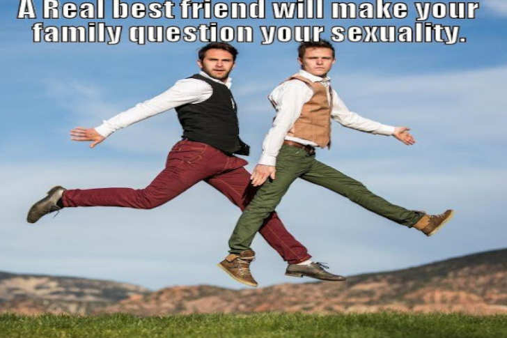 This meme jokes that a real best friend will do things so chaotic, it makes your family question your sexuality. The image of two men jumping dramatically in matching vintage outfits plays into the joke, as their over-the-top friendship looks suspiciously romantic to outsiders. It’s a lighthearted way to tease your closest friend about your chaotic, unapologetic bond.
