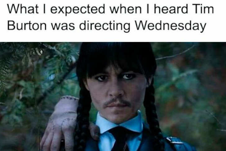This meme jokes about what fans expected when they heard Tim Burton was directing Wednesday—a dark, gothic version starring Johnny Depp in drag as Wednesday Addams. It plays on Burton’s signature style of casting Depp in quirky roles, and the absurdity of the image perfectly captures the internet’s love for over-the-top predictions.