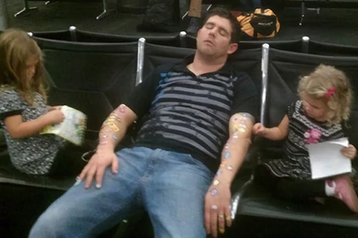 This photo captures the ultimate airport parenting fail—or win, depending on how you look at it. A tired dad decided to take a nap while waiting for his flight, completely unaware of the mischievous sticker ambush brewing around him. His two little daughters, clearly bored but highly entertained, took the opportunity to turn their sleeping father into a human sticker canvas. His arms are covered in colorful decals, proof that kids will always find a way to entertain themselves when left unattended.