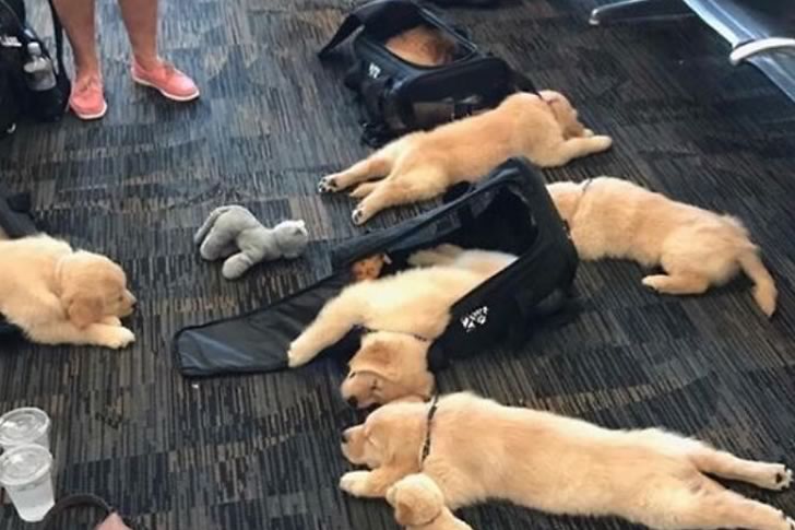 Amid the hustle and bustle of a busy terminal, this unexpected sight of napping golden retriever puppies turned the airport into an impromptu cuddle zone. Lying sprawled across the floor like they just completed a cross-country flight themselves, these little fluffballs couldn’t care less about delays or boarding gates. Their luggage? Open puppy carriers. Their comfort items? Stuffed animals and each other. It’s the kind of scene that makes even the most stressed traveler stop, smile, and forget their gate number.