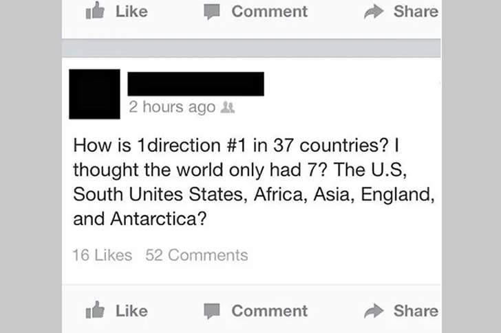 Ces histoires de facepalm sont si stupides que vous en oublierez vos propres erreurs 20. La logique de One Direction Advertisements Publication originale Advertisements PrécédentPage suivante Meilleur commentaire : Affirme qu’il y en a sept, n’en liste que six… @Hanykins Advertisements PREV NEXT PAGE