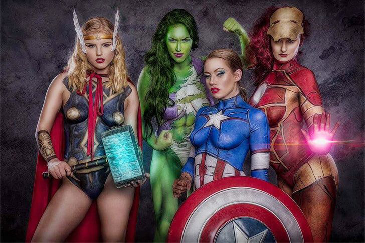 Diese Damen haben sich als Mitglieder der Avengers verkleidet, der berühmten Superheldengruppe aus den Marvel-Comics. Obwohl die originalen Charaktere in den Comics hauptsächlich männlich sind, präsentieren sie eine faszinierende weibliche Interpretation dieser Ikone.