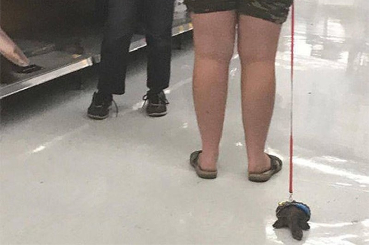 Wir wissen von keinem Verbot für Haustiere in Walmart. Deshalb ist es nicht überraschend, wenn man solche Tiere im Laden sieht. Wir sind uns nicht sicher, warum diese Person beschlossen hat, ihre Schildkröte als Haustier mit nach Walmart zu nehmen, aber wir fragen uns nicht weiter.