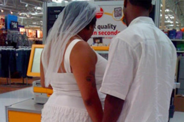 Hast du jemals ein Paar in Hochzeitskleidung in Walmart gesehen? Nun, jetzt hast du es. Wir alle wissen, wie teuer Hochzeiten und Fotografen sein können. Dieses Paar hat sich für den billigeren Weg entschieden und hat ihre Hochzeitsfotos in der Fotokabine für 4 Dollar machen lassen. Es mag ungewöhnlich erscheinen, ein Paar in Hochzeitskleidung beim Einkaufen zu sehen, aber wir hoffen, dass dieses Paar sein Leben lang glücklich zusammen ist.