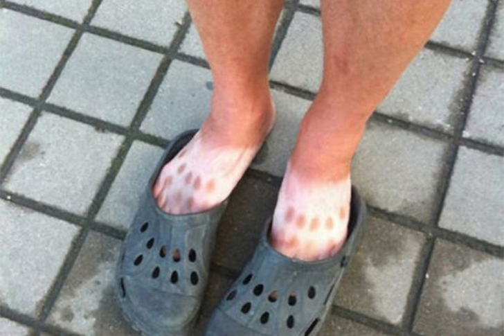 Diese Crocs sind ohnehin hässlich genug. Wenn man einen schlimmen Sonnenbrand dazu addiert, ist es fast sicher, dass er den ersten Platz im Wettbewerb um die hässlichsten Füße der Welt bekommt.