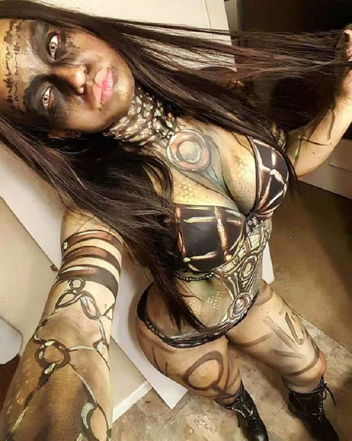 Roxy, eine leidenschaftliche Instagram-Nutzerin, hat sich mittels eines Makeovers in Enchantress verwandelt, eine böse Zauberin aus den DC-Comics. Diese Schurkin nutzt den Körper von June Moone, um ihre finsteren Absichten zu verfolgen. Ihre Kräfte umfassen Telekinese, Teleportation, Energieprojektion und Nekromantie. Dieser Look basiert auf der Darstellung von Cara Delevingne im Film “Suicide Squad”. Roxy suchte Unterstützung vom Bodypainter Jose Guajardo, um diesen Look zu gestalten.