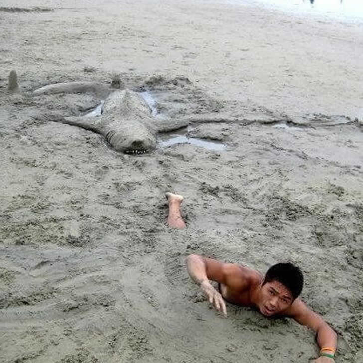 Er ist vielleicht nicht in Hollywood, aber dieser Typ bringt das Drama mit. Mit einem voll ausgearbeiteten Hai aus Sand und dem perfekten Gesichtsausdruck des “Hai-Angst-Schreis” verdient dieses Foto einen Preis. Die Hingabe? Makellos.