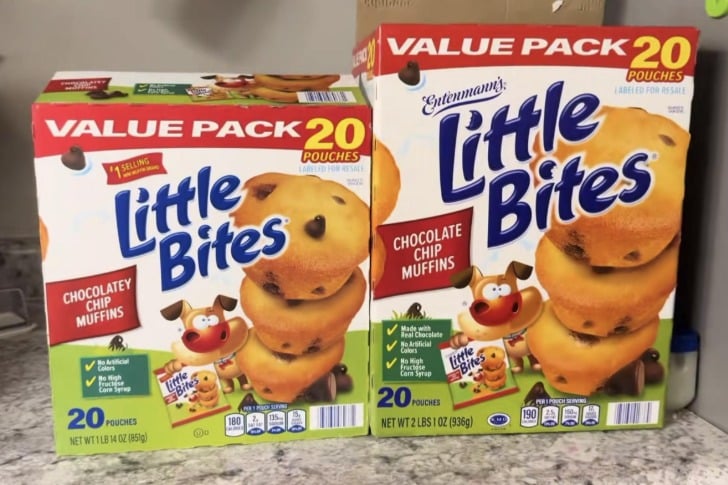 Reducción de tamaño y calidad en la misma actualización de empaque. Todavía 20 bolsitas en el “paquete económico”, pero ahora el paquete es de solo 1 libra 14 oz en lugar de 2 libras 1 oz. Además, no hay suficiente chocolate para llamarlos “muffins con chispas de chocolate”; tienen que usar “sabor a chocolate” como descriptor y eliminaron “hecho con chispas de chocolate reales” del cuadrado verde.