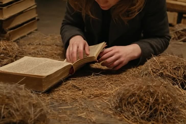 Während sie tiefer in das Lagerhaus vordrangen, stießen sie auf etwas, das wie alte Tiernester aussah – Ansammlungen von Fell, verstreute Federn und angeknabberte Knochen. Emma kniete sich neben eines davon und hob ein Büschel Fell zwischen ihren Fingern hoch. „Das passt nicht zu Nyx“, murmelte sie. Ethan, der in einem staubigen, zerfledderten Buch in der Nähe blätterte, seufzte frustriert. „Nichts davon ist hilfreich“, sagte er. Sie suchten jede Ritze ab, in der Hoffnung auf etwas, das Nyx’ Ursprünge erklären könnte.