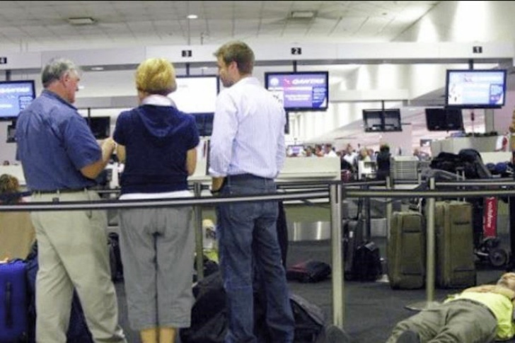 Diese Szene wirkt besonders kurios: Der schlafende Mann liegt mitten im Check-in-Bereich, während andere unbeeindruckt ihren Weg gehen. Vielleicht sucht er sich nächstes Mal eine ruhigere Ecke.