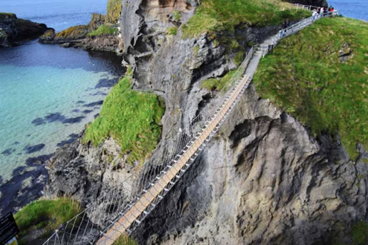 Le pont de corde de Carrick-a-Rede est situé dans le comté d’Antrim, en Irlande du Nord. Il mesure 20 mètres de long et environ 30 mètres de haut par rapport aux rochers (l’équivalent d’un immeuble de 9 étages). Ce pont est une attraction touristique célèbre, visitée par environ 200 000 personnes par an, et même environ 480 000 en 2018.