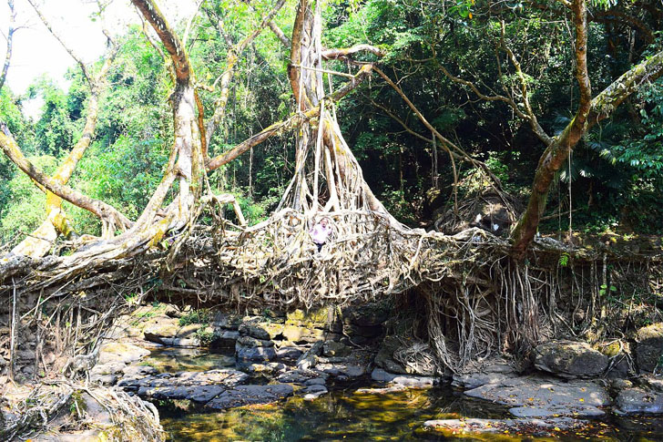 Ces ponts utilisent les racines aériennes du caoutchouc, résultat de l’ingéniosité des Khasi, une tribu qui a perfectionné l’art de la construction de ponts pendant plus de cinq siècles. Les habitants sont fiers de la robustesse de ces ponts naturels, et bien que leur stabilité soit avérée, il faut un courage considérable pour traverser ces ponts qui s’élèvent à plus de 30 mètres de hauteur.