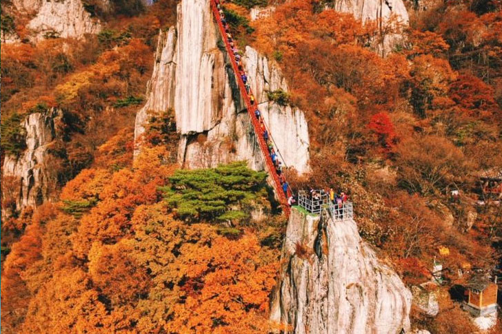 Le mont Daedunsan, en Corée du Sud, culmine à 880 pieds (environ 268 mètres) de haut, et son pont nuageux est situé à 243 pieds (environ 74 mètres) au-dessus du terrain escarpé. Cette montagne est l’une des destinations de randonnée les plus prisées de Corée du Sud, offrant des paysages à couper le souffle. Le paysage verdoyant et pittoresque rendra votre expérience de randonnée inoubliable.