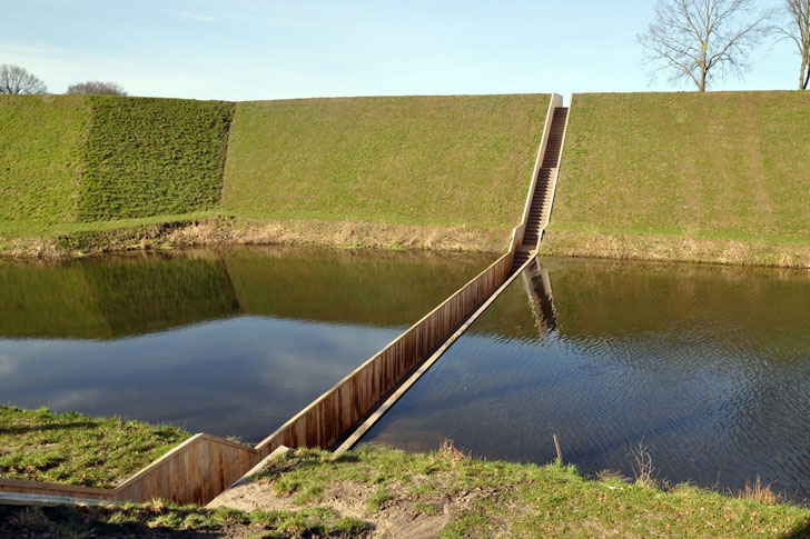 Le pont Moïse, situé aux Pays-Bas, est réputé pour sa conception unique. Selon l’angle de vue, ce pont semble immergé sous l’eau, donnant l’impression que les piétons marchent à la surface de l’eau. Il a été conçu par les architectes de RO&AD Architecten et enjambe les douves du Fort de Halsteren, en Brabant-Septentrional.