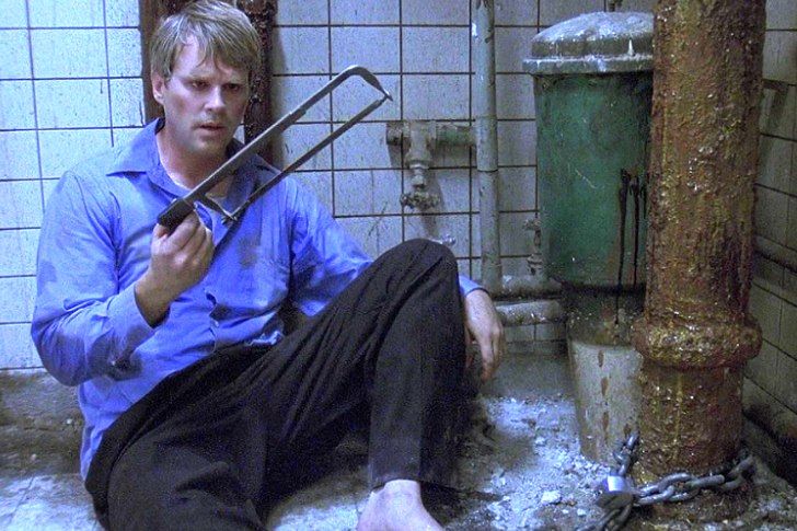 Le filmSawde James Wan piège des inconnus dans des jeux moraux mortels orchestrés par le machiavélique tueur Jigsaw. Cary Elwes et Leigh Whannell se réveillent enchaînés dans une salle de bain crasseuse, luttant contre la montre avec des scies à métaux et des choix de vie ou de mort.
