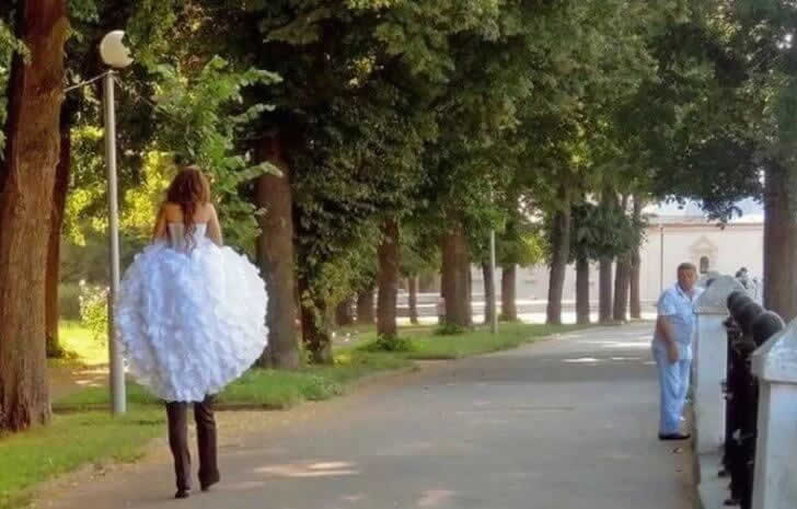 No, she’s not nine feet tall with mile-long legs. What you’re actually seeing is a clever lift from her groom, who’s hidden under the voluminous gown. The result? A towering bride with what appears to be a very confusing wardrobe choice.