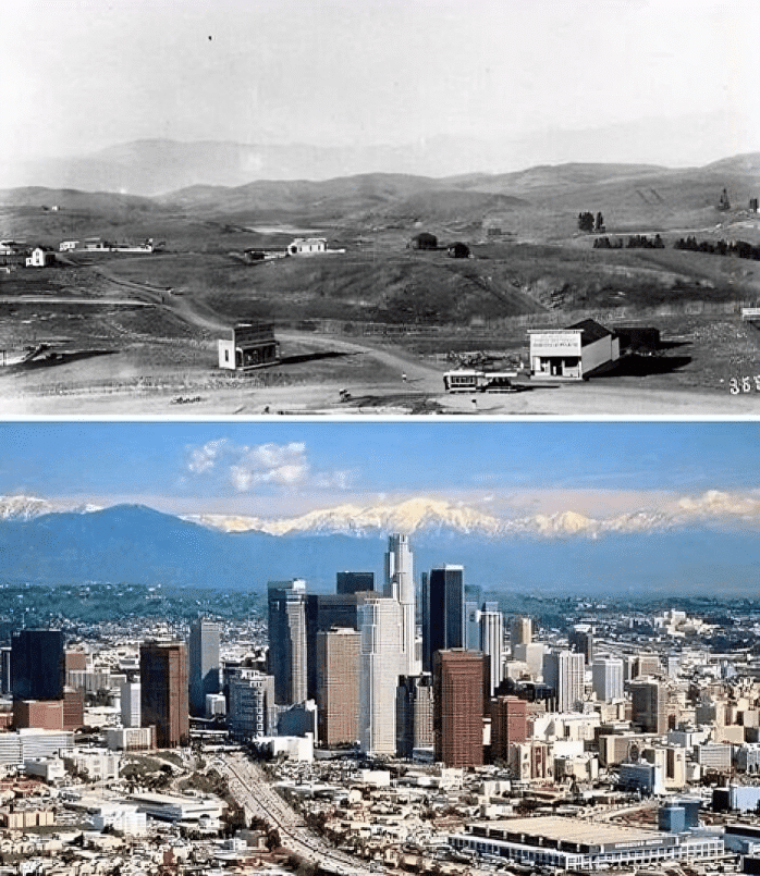 You probably recognize the city in the second photo as downtown Los Angeles, but do you recognize the city in the first one? That’s right; it’s downtown Los Angeles. Only 100 years separate these two photos; they look like they could have been taken in completely different places and parts of the world.