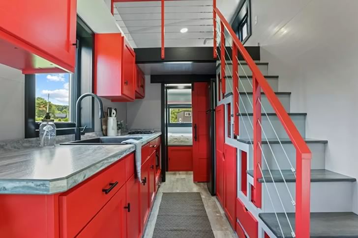 Next to the living area, the kitchen stands out with its practical design and custom cabinetry. It’s compact yet impressively equipped, featuring a refrigerator, microwave, deep sink, and a three-burner stove—all essentials for cooking hearty meals in a small space.