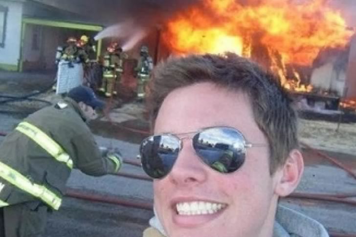 This image pushes the limits of extreme selfies, blending a life-threatening situation with a carefree pose. The contrast between the person’s grin and the chaos of the fire scene highlights their fearless spirit, turning a dangerous moment into a striking and humorous snapshot. It’s a wild example of capturing an unforgettable photo under intense circumstances.