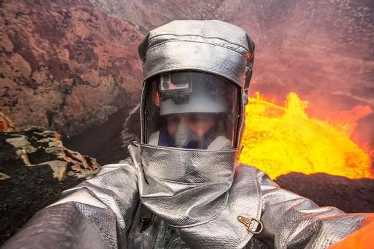 This image features an intense extreme selfie where a person in a heat-resistant suit takes a photo near a flowing lava stream. Wearing a protective helmet and visor, they hold the camera steady with glowing molten rock in the background. The rugged terrain adds to the perilous atmosphere of this volcanic scene.