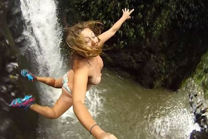 This image showcases an exhilarating extreme selfie where a woman captures herself mid-jump off a waterfall. Wearing a bikini and colorful shoes, she smiles with arms outstretched as water cascades around her. The lush greenery and pool below add a vibrant backdrop to this daring leap.