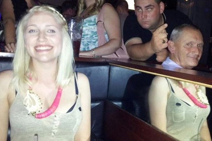 Als die Dame links dieses Ensemble wählte, ahnte sie wohl nicht, dass sie damit einen der kuriosesten Selfie-Fails landen würde – der gleichzeitig ein voller Erfolg ist. Diesen ungewollten optischen Trick verdankt sie der speziellen Spiegelkabine, in der sie Platz nahm.