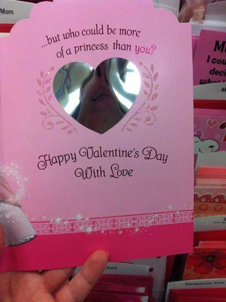 Wenn man verliebt ist, hält man seinen Partner für den schönsten Menschen auf Erden. Diese Grußkarte versuchte, daraus Kapital zu schlagen, indem sie einen kleinen Spiegel enthielt. Die Idee war, die Empfängerin als „Prinzessin“ zu bezeichnen, während sie in ihr Spiegelbild blickte. Leider verzerrte der billige Plastikspiegel ihr Gesicht zu einem Monster.