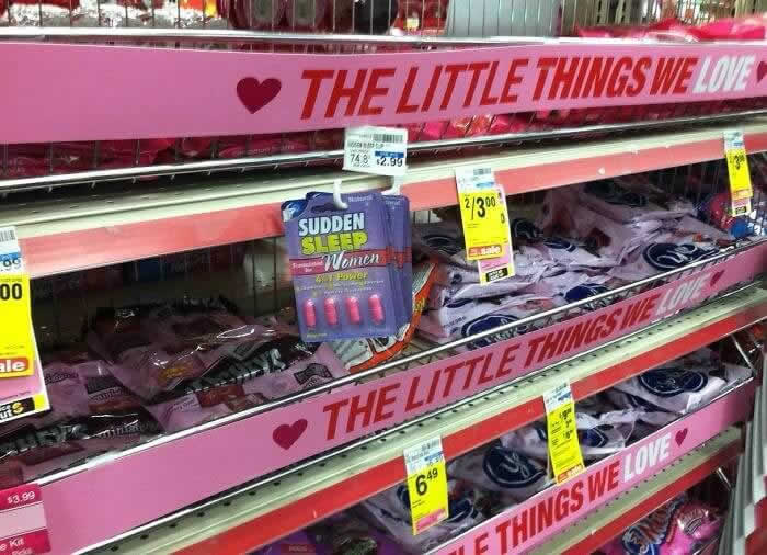 Wir alle haben Horrorgeschichten über schlechte Dates gehört, und Sicherheit ist für viele Frauen ein großes Anliegen. Sie werden ständig daran erinnert, auf ihre Getränke zu achten und wachsam zu bleiben. Diese Ladenauslage trägt nicht dazu bei, diese Ängste zu lindern. Direkt neben den Valentinskarten haben sie „schnellwirkende Schlafmittel“ vorrätig.