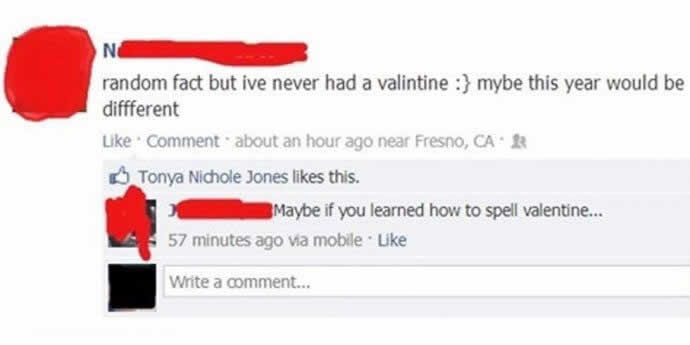 Nicht jeder hat ein Date für die Feiertage, und soziale Medien sind ein häufiger Ort, um sich darüber auszulassen. Ein Nutzer beklagte, dass er noch nie einen „Valintine“ in seinem Leben hatte. Ein hilfreicher Kommentator wies darauf hin, dass er vielleicht mehr Glück hätte, wenn er lernen würde, das Wort richtig zu schreiben.