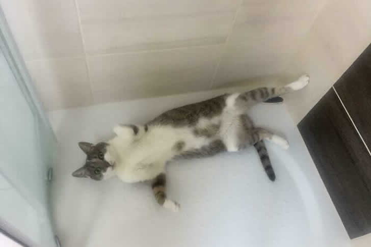 猫が昼寝に選びそうにない場所の筆頭がシャワー室です。だって猫と水は油と酢のように相性が悪いから。なのに、この謎の猫は乾いたシャワー室を自分だけの聖域にしています。蒸気も水もなく、冷たいタイルと静かな孤独だけがそこにあります。猫だけが知る理由で、このタイル張りの空間は家の騒音から離れた静かな隠れ家となっています。