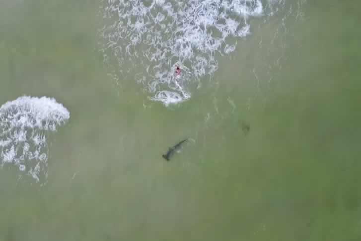 このドローンで撮影された写真は、フロリダ州パナマシティのビーチで撮られたもので、女性が危険なほど近くにいるハンマーヘッドシャークに気づいていない場面を捉えています。サメがますます近づく様子を見て、この女性がどれほどの恐怖を感じたか想像するのは難しくありません。また、周囲の傍観者たちがこの状況をどれほど心配したかも、容易に想像がつきます。