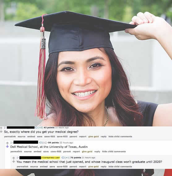 當一位使用者開始以醫生的身份提供「專業」建議時,一位懷疑者便詢問他們究竟是在哪裡取得醫學學位。這位詐騙醫生的模糊且語無倫次的回答,立刻就讓人明白他完全是個冒牌貨。